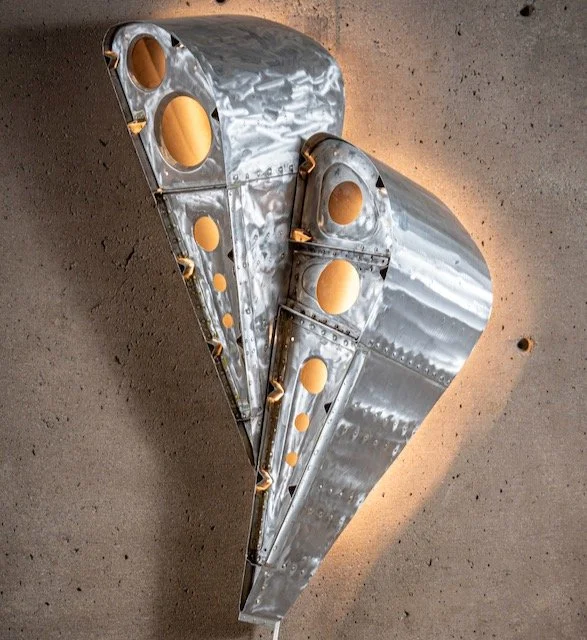 The wood is hand cut by me in and around the city of Vancouver. Many of the objects are aircraft parts such as wings, propellers and helicopter blades. Most of my material is recycled.