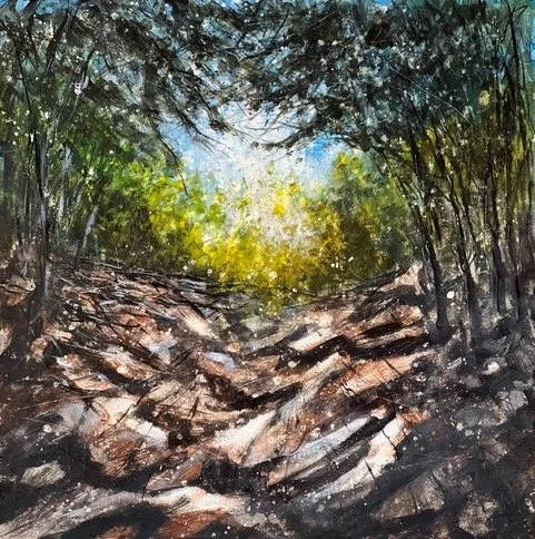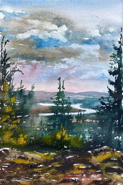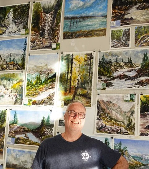 With watercolours, Chris works mostly en plein air to capture the environment in its purest, creating fresh images brimming with immediacy. At his studios at home in New Westminster and on Granville Island he portrays his wilderness treks into loose acrylic depictions.