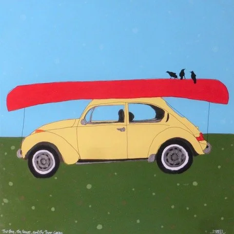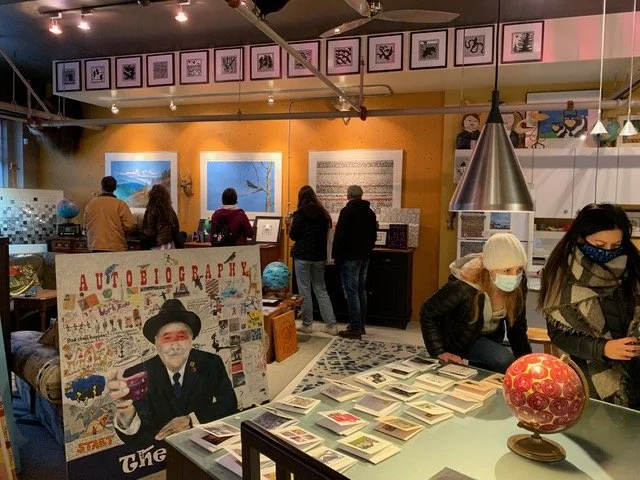 I now explore other themes and techniques, particularly acrylics, linocuts, ink drawing and collage. With acrylics, I did a series of birds in trees, from the shy nuthatch to the noisy crow. With small linocuts, I illustrated a poem, 'Thirteen Ways of Looking at a Blackbird' by Wallace Stevens, and illustrated a series of haiku I’ve written. I painted and drew on a series of world globes. I create chap books about my art and poetry and what I come across in the world around me. Recently, I've focused on two projects. The first is a series of abstract ink drawings with an urban theme. The second are works, 4 ft x 4 ft, in acrylics and collage based on a series of plot structures.
